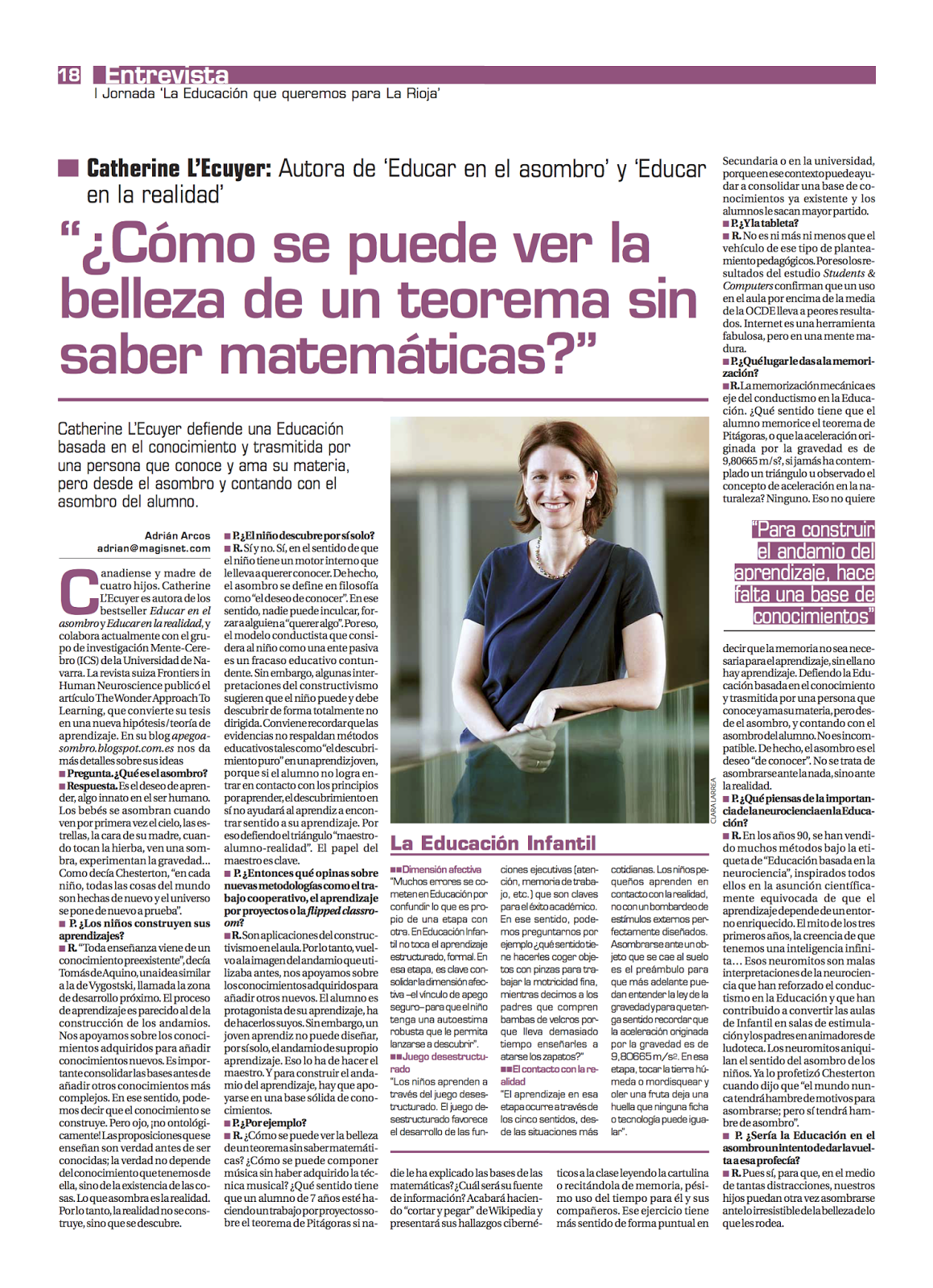 Canadiense y madre de cuatro hijos, Catherine L’Ecuyer es autora de los bestseller Educar en el asombro y Educar en la realidad, y colabora actualmente en el grupo de investigación Mente-Cerebro (ICS) de la Universidad de Navarra. La revista suiza Frontiers in Human Neuroscicence publicó el artículo The Wonder Approach to Learning, que convertirá su tesis en una nueva hipótesis / teoría de aprendizaje.